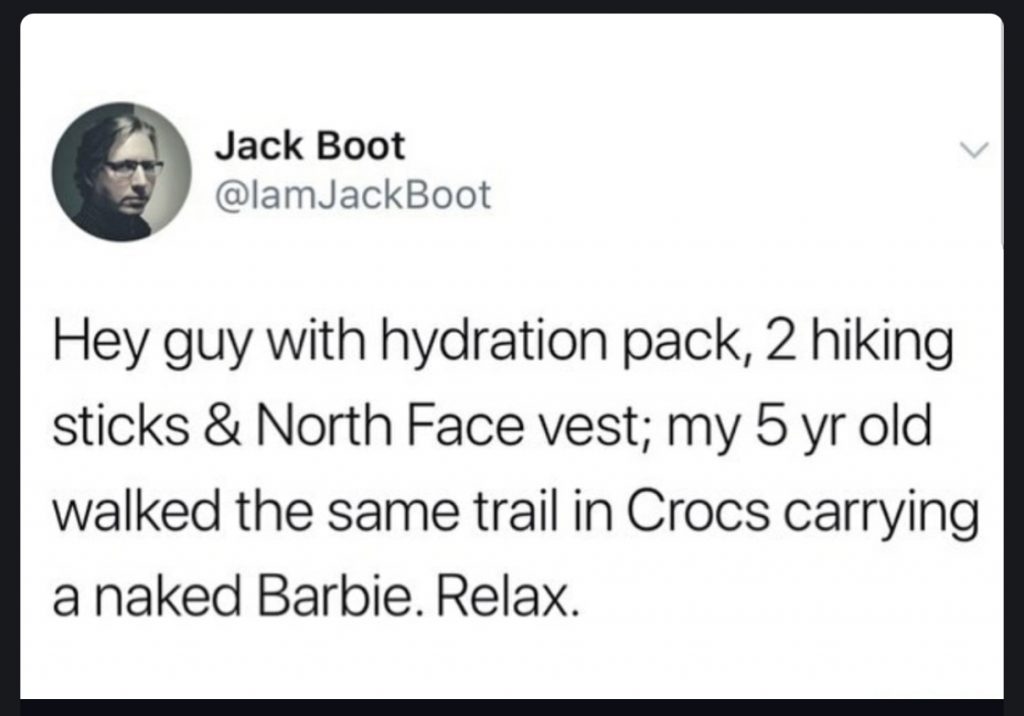 Why the derision against being prepared? Sure, we all know “that guy” – the gear guy who always has more stuff than he seems to need. But why the snide remarks and the snap judgements about someone you don’t even know? How do you know that the guy with two hiking sticks doesn’t have a disability? Double knee replacements? Severe arthritis? We don’t. But it’s fun to laugh at him for having more gear than “we” think he needs. The thing is – “that guy” may well have survived the hike that this tragic family did not.
