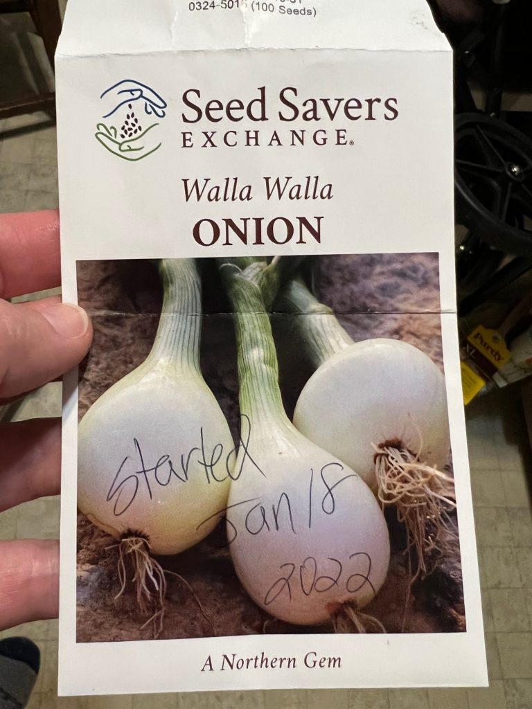 Bunching onions never bulb-up and you eat them as green onions, and they only take 60 days (according to the seed packet). So I put some in a large-ish pot in the window and we’ll see what they do. My hope is that these will be up and producing for the cook pot around the time that last year’s onions have been used up. (Yes, I know I could just go buy more from the store, but this is an experiment durn it!)