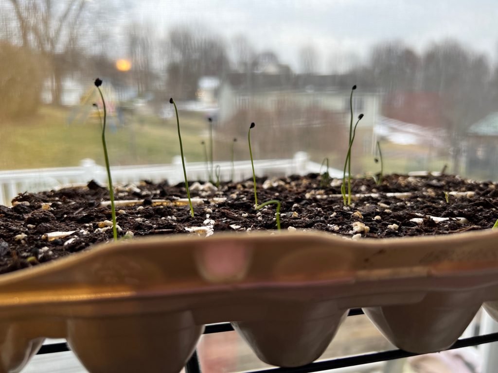 Although I had a great onion harvest last year, I discovered that it wasn’t enough. I go through a lot more onions in my cooking than I ever imagined. I was able to “cure” the biggest ones and store them in the basement, and the smallest ones I chopped and dehydrated for future recipes. But I’m running low already and what’s left will likely not get me to the next harvest. So I’m trying to grow “bunching onions” in the window to get me through.