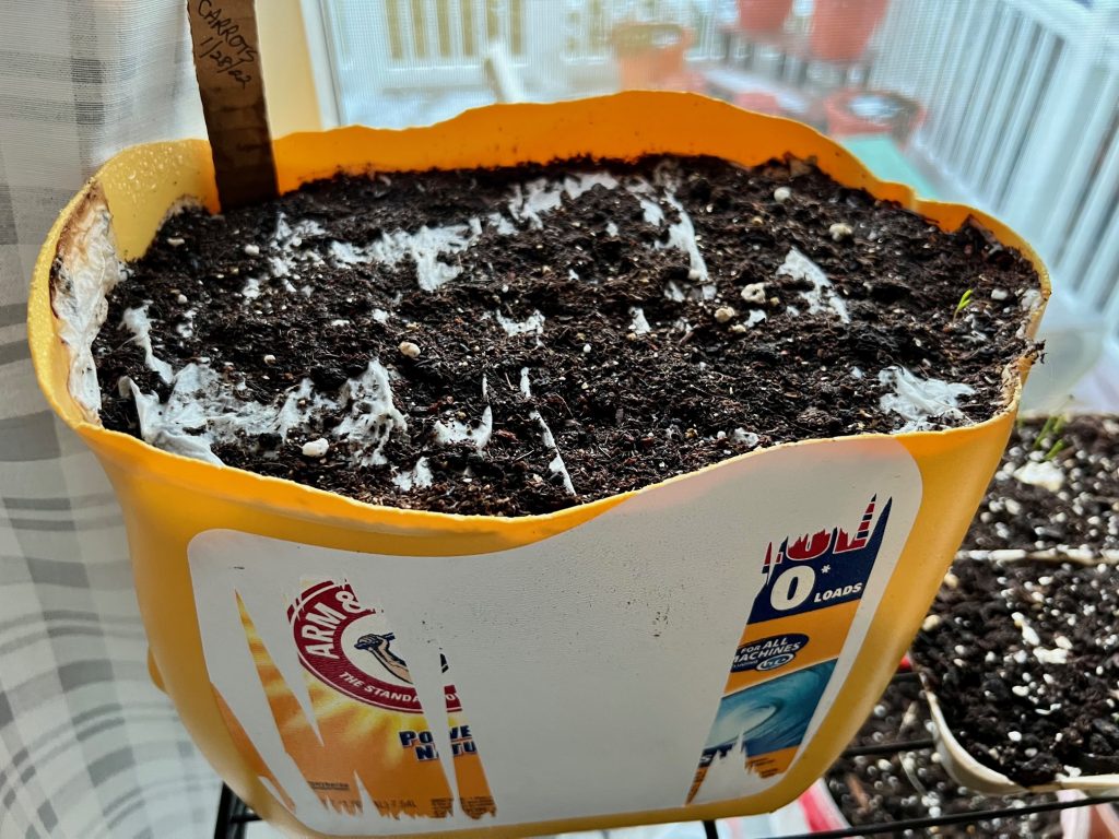 So this time I’m growing in a laundry detergent container (I am not a hoarder) which is a few inches taller than my previous indoor pots. And this carrot variety only gets 4 inches long. I’ve got a few spouts already, but it will take a few months for results. We shall see. IF it works, then this is another apartment-dweller’s option for adjunctive nutrition.