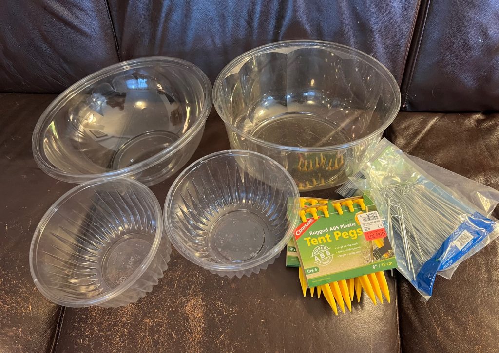 You can buy commercial “cloches” as they are called, from garden supply places – but at ridiculous prices. Priding myself on being a CheapAss Gardener(tm) however, I’m going to use leftover takeout salad bowls (from three years ago before I started growing my own – I’ve got at least a dozen) and a bakery cake cover I salvaged from our garbage (I am not a hoarder). I’ll use small tent stakes and landscape staples to anchor them in the wind and we’ll see what happens.