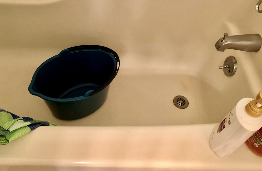 The first step was sitting a bucket under the shower while the water warmed up. That gave me 2-3 gallons daily, which I dumped into a lidded Rubbermaid tub outside the back door. The lid helped to deter mosquitos and the idly curious pet or wildlife. This was completely clean, potable water which would have otherwise run down the drain. I was previously wasting it, so I considered it “free” garden water even though I was technically paying for it.