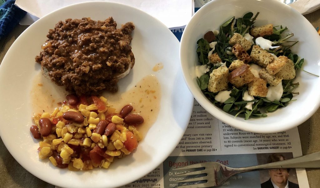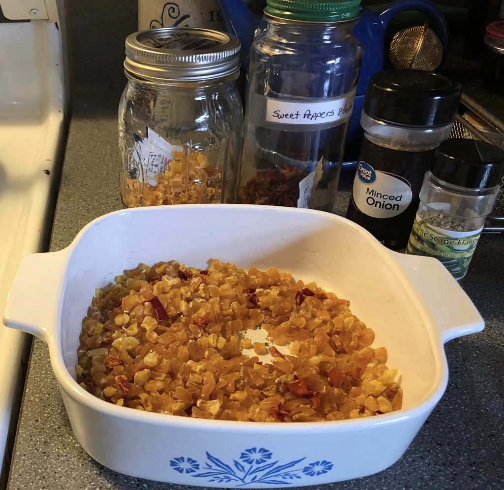 I wanted a side dish to go with the sloppy joe meat from my venison and boar, so I pulled out my dehydrated corn, dehydrated peppers and dehydrated onions, rehydrated them and added outdated canned kidney beans and some frozen chopped cherry tomatoes from my window garden. I dumped the last of the bottled salad dressing over it and Ta-da – Corn Salad!