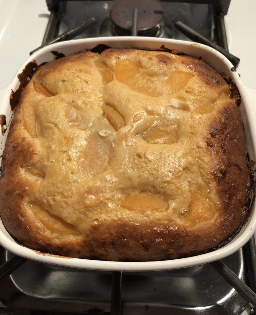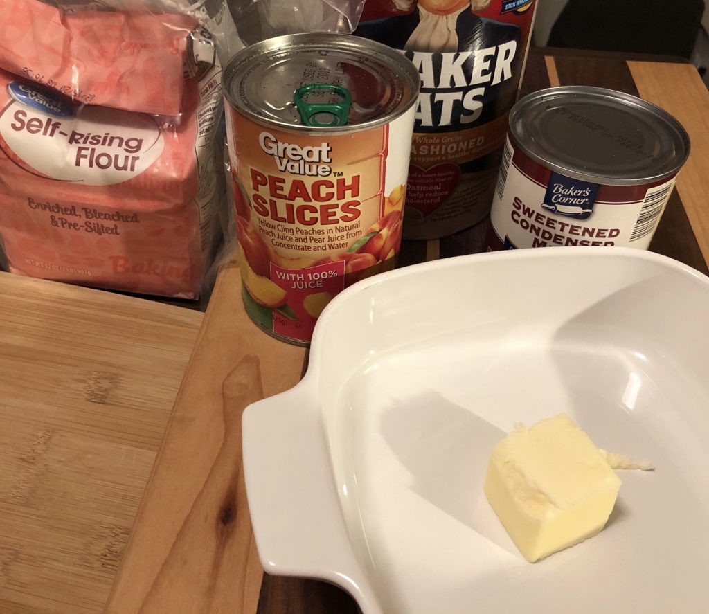 After the success with the hash, I decided to see if I could do something similar with some outdated canned peaches and outdated sweetened condensed milk. After a little recipe Googling, I had a frame work. Add some self-rising flour (it already has baking powder in it), a little butter and some oatmeal, and I had peach cobbler!