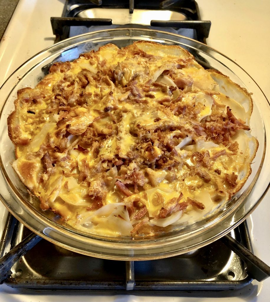 I had dehydrated red potato slices that I dehydrated last summer. I had canned evaporated milk, I had a partial tub of french fried onions left from green bean casserole months ago, I had American cheese, and I had bacon grease still in the pan from breakfast (trying to conserve my butter supply).