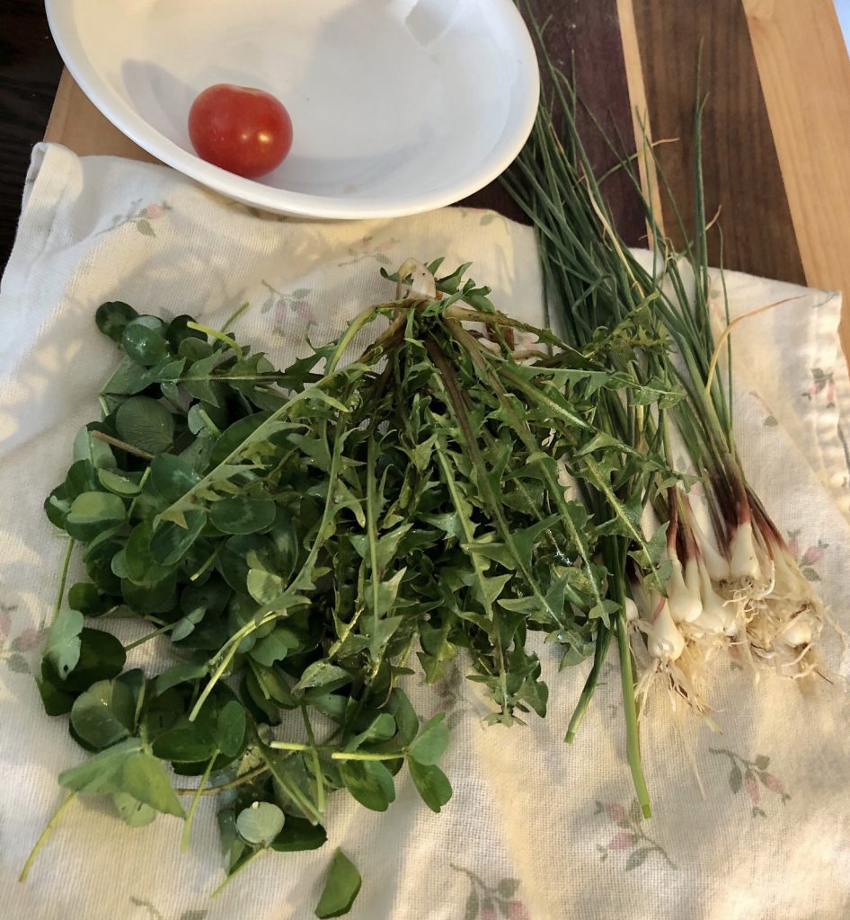 My window lettuce wasn’t ready to harvest yet, and my fridge romaine was getting ugly, so for two weekends in a row I ate dandelion and clover salad for my fresh greens serving. After that the dandelions started to bloom, so I switched to using the flowers.