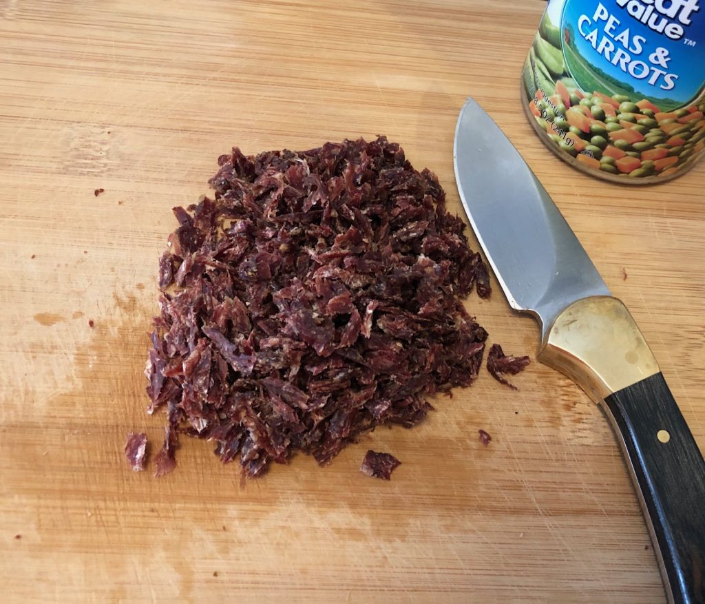 Besides those outdated canned goods I also had some homemade beef jerky that needed to be used soon, so I decided to chop that up fine and soak it in water overnight in the fridge and see if I could make a hash of it.