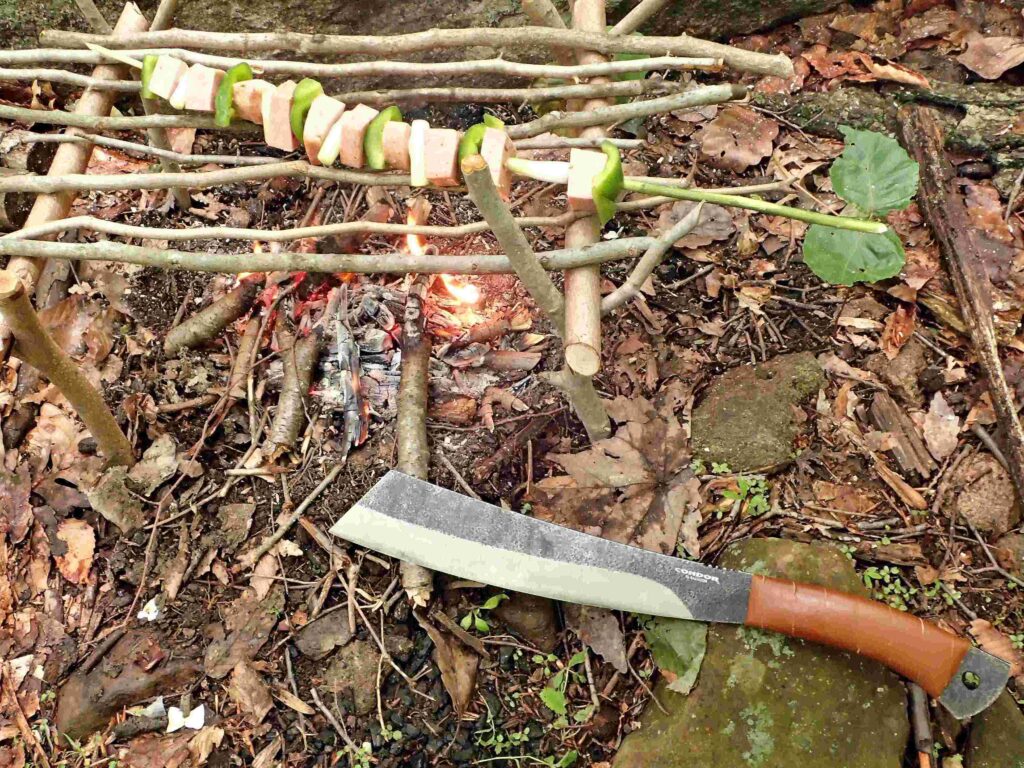 The machete is perfect for chopping finger-to-broomstick-thick green wood, like the branches I used to build a swamp grill that keeps you off the damp ground. I gathered thick “Y” branches and thinner pieces with just a few chops each. Using a pilot stick helped quickly drive those “Y” sticks into the ground.