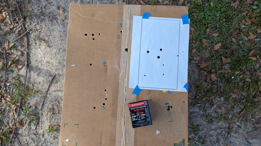 Every load was patterned at 10 yards from a standing position, and five shots of each were fired with every load but one. I only had four rounds of Federal .410 handgun, and it seems to be out of production. My target is a slightly shrunk IPSC A-Zone.