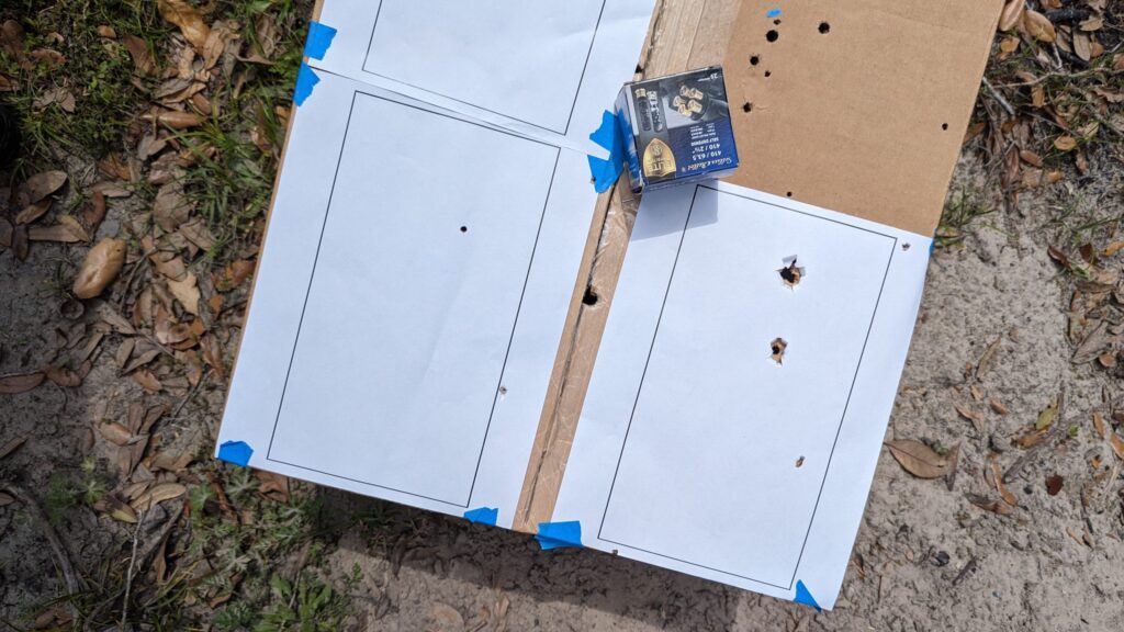 It’s got very low recoil and fires easily. Not every pattern was this tight, but they were within 2-inches or so. The FTX slug tends to penetrate a little less than desired, but the two .35 caliber pellets tend to penetrate well.