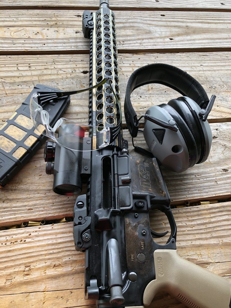 I next took my trusty AR15 out for a test run with this earmuff and glasses combo to see how they fit with my rifle set up. Everything again worked well and quite comfortably. However, despite the listed claim of an anti-fog coating, I did have an issue with the glasses fogging in the humidity of the range. In their defense, I also deal with the hot flashes inherent to women in my demographic – which challenges the best of fog coatings. I have this problem with all my other glasses as well, so It’s a “me” thing, not necessarily a failure of the product.