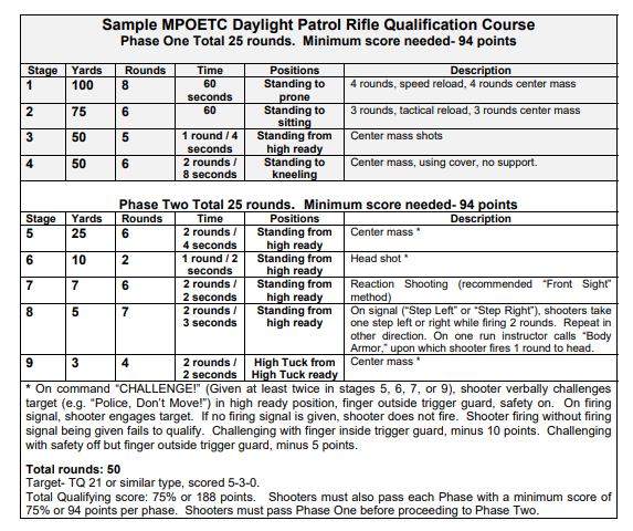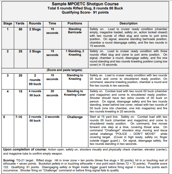Most police shotgun quals are at the bottom of the barrel. The MPOETC stands out as one of the best. It involves both slugs and buckshot phases. The qual requires a repeating shotgun, be it a pump or semi-auto. Shooters will need five slugs and eight rounds of 00 buckshot.