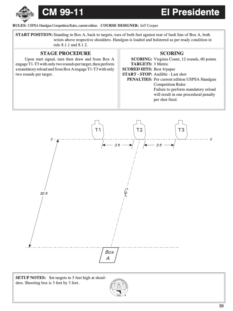 *For pure training purposes, there’s no harm in shooting IDPA targets, but El Presidente is traditionally scored IPSC/USPSA style.