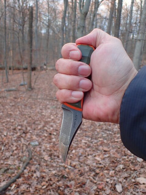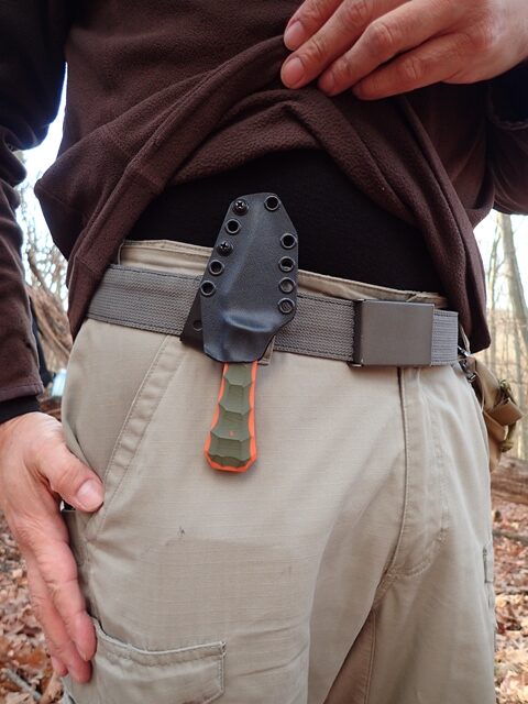 The author carried the Pocket Bowie EDC Knife inverted, and the knife stayed secure and easy to get.