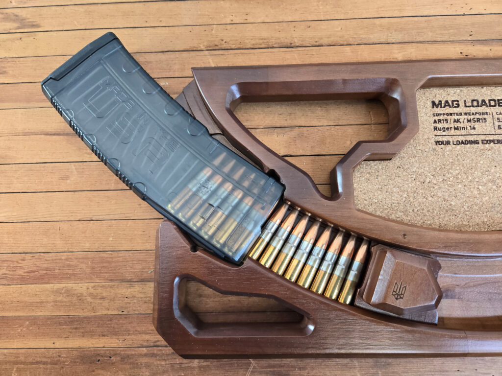 Once everything is lined up, you use the pusher block to simply push the rounds into the magazine. It takes longer to sort the rounds than it does to load the magazines. It’s literally a matter of seconds to fully load a 30 round magazine. It’s also way easier on the thumbs since you have the big loading block to grab hold of to insert the rounds rather than thumbing them in one round at a time.