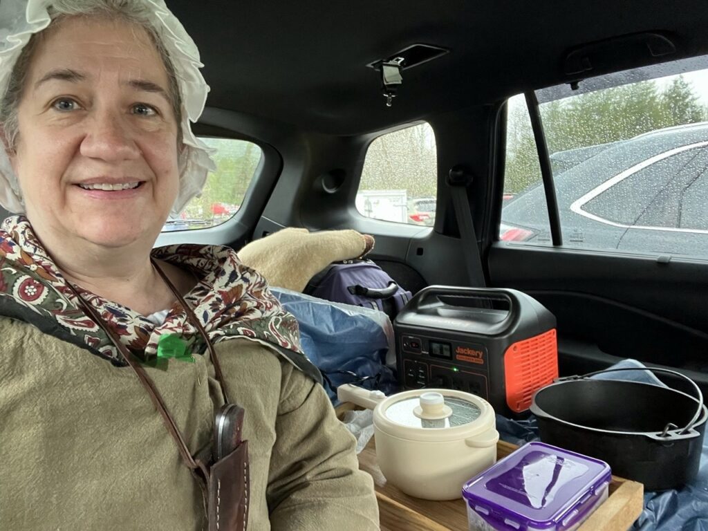 Yeah, about that. Did I mention that there was periodic torrential rain, tornado watches, and a small stream flooding the first night and day? Weather like that is kind of hard on 18th-century campfires—and the cooks. There were hearths going inside the log buildings, but space and coals at those were at a premium, considering we were feeding over 100 people. So what did I do?