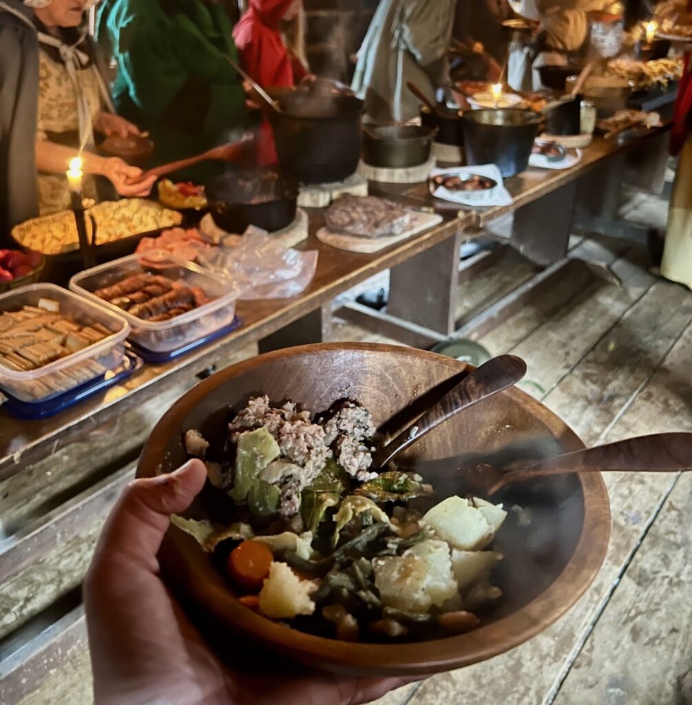 Nonetheless, attendees were asked to bring a period-appropriate covered dish to the “fort feast” on the first evening. No problem I thought, I’ll bring green beans and potatoes (from my dehydrated stash), prep ahead, refrigerate, and just reheat in cast iron over someone’s cook fire on the day.