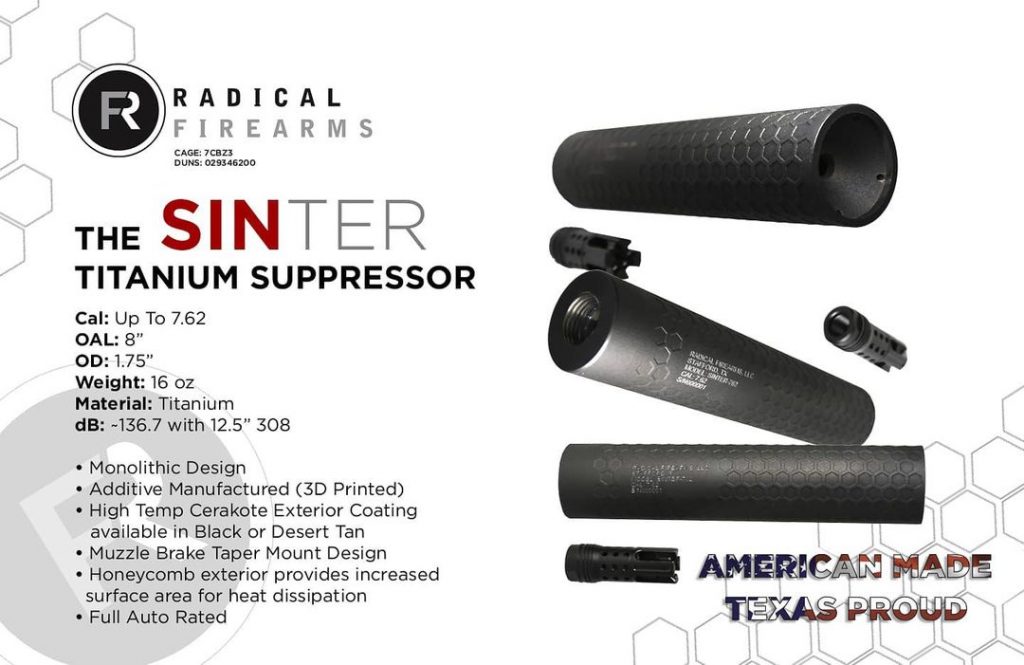 The SINTER is a monolithic 3D-printed 6Al-4V Titanium silencer from Texas silencer company Radical Firearms.