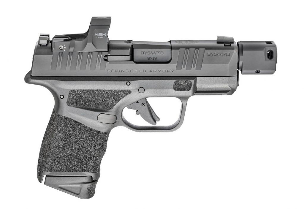 This is the newest Springfield Armory Hellcat: the Hellcat RDP, or “Rapid Defense Package”. Among the features of the new micro-blaster are a newly-released pistol red dot sight from Springfield’s own HEX series, a threaded barrel, and a “self-indexing” compensator.