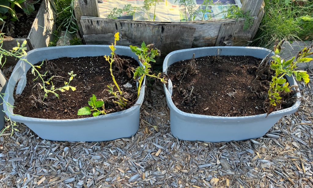 I don’t know if you have grown potatoes before, but in my experience you have to wait until the plant above ground withers and dies before you dig up your spuds. That leaves my garden tubs looking terribly neglected. But having a little patience and ignoring the decay can reap the reward of bigger, more delicious tubers come harvest time.