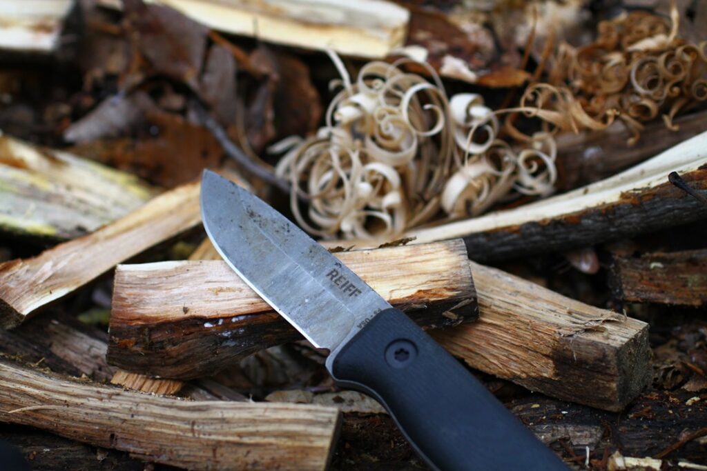 The Reiff F3 sitting pretty after splitting oak fuel and shaving feathers for a cook fire.