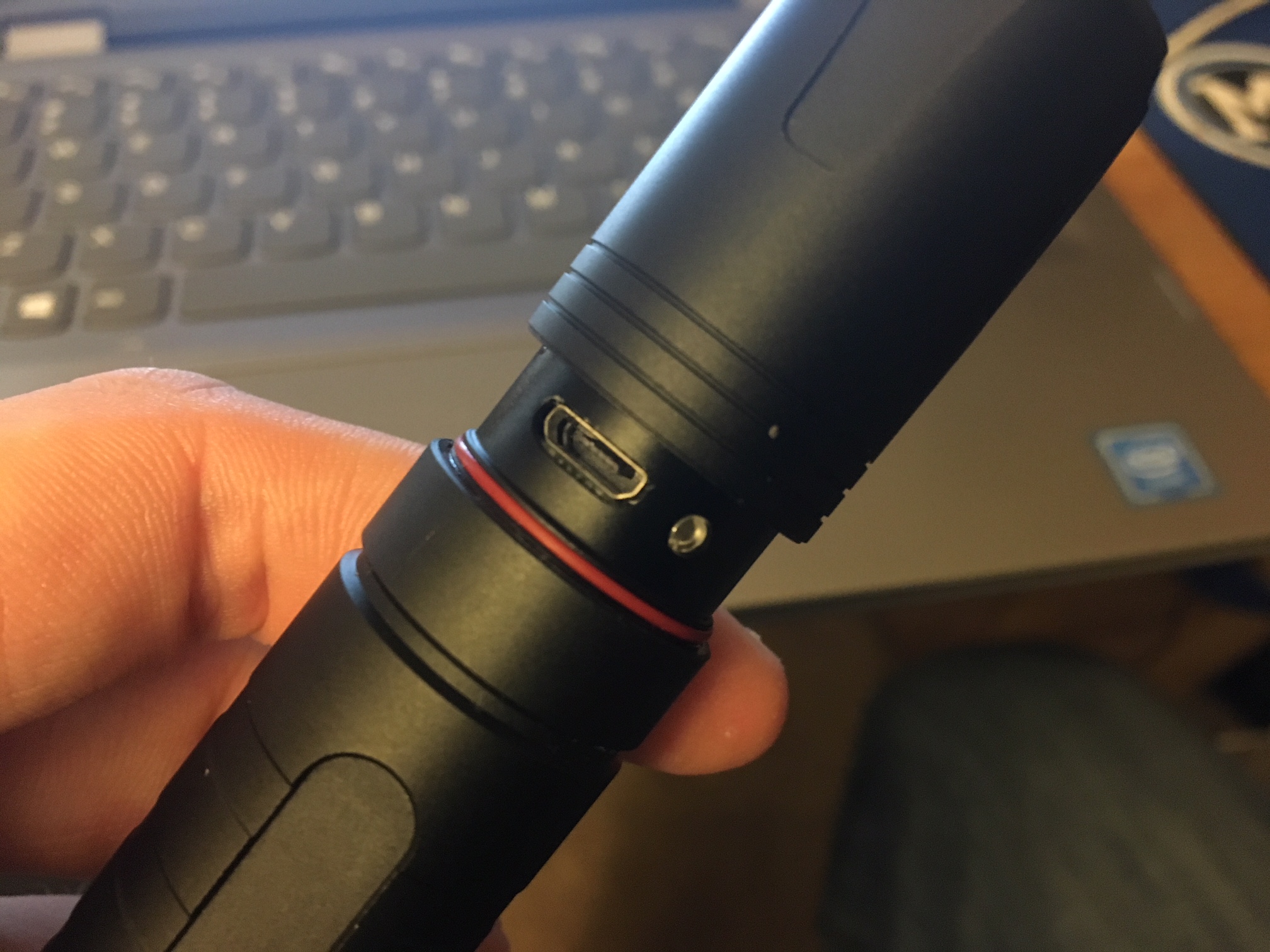 By twisting the whole bezel reflector assembly counterclockwise we reveal a micro USB charge port, o-ring protected. You can plug the light in to recharge it without removing the 18650 battery. Anything with a USB port can now charge your carry light. Confirming if the Tungsten is charged is now as simple as plugging it in, like your phone it will tell you. Red light: Charging. Green light: Charged.