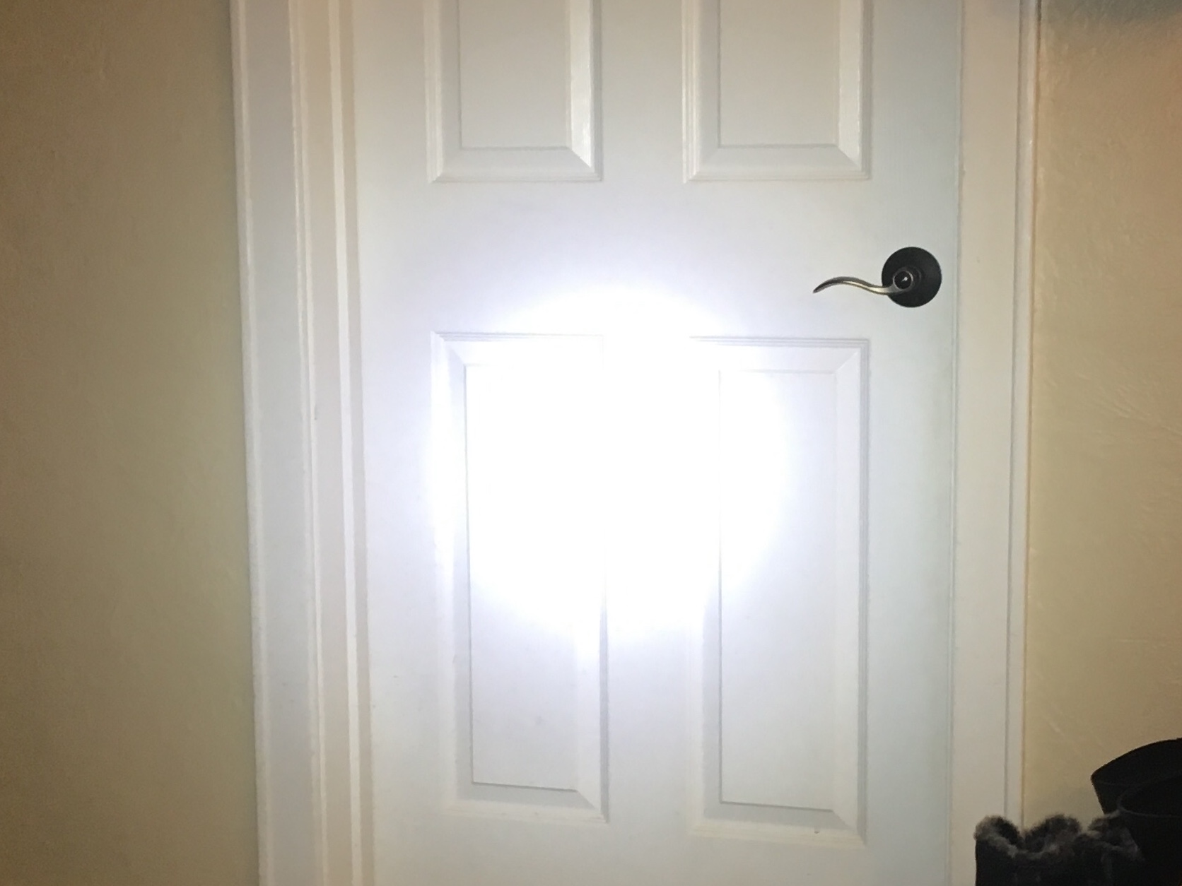 The light from the Tungsten is rated for 129 meter usability. Indoor distances produce an efficient focused cone with a clean secondary ring approximately three times the focused diameter. It is not blinding off of bright surfaces at any indoor distances (minus mirrors) making it comfortable to use room to room.