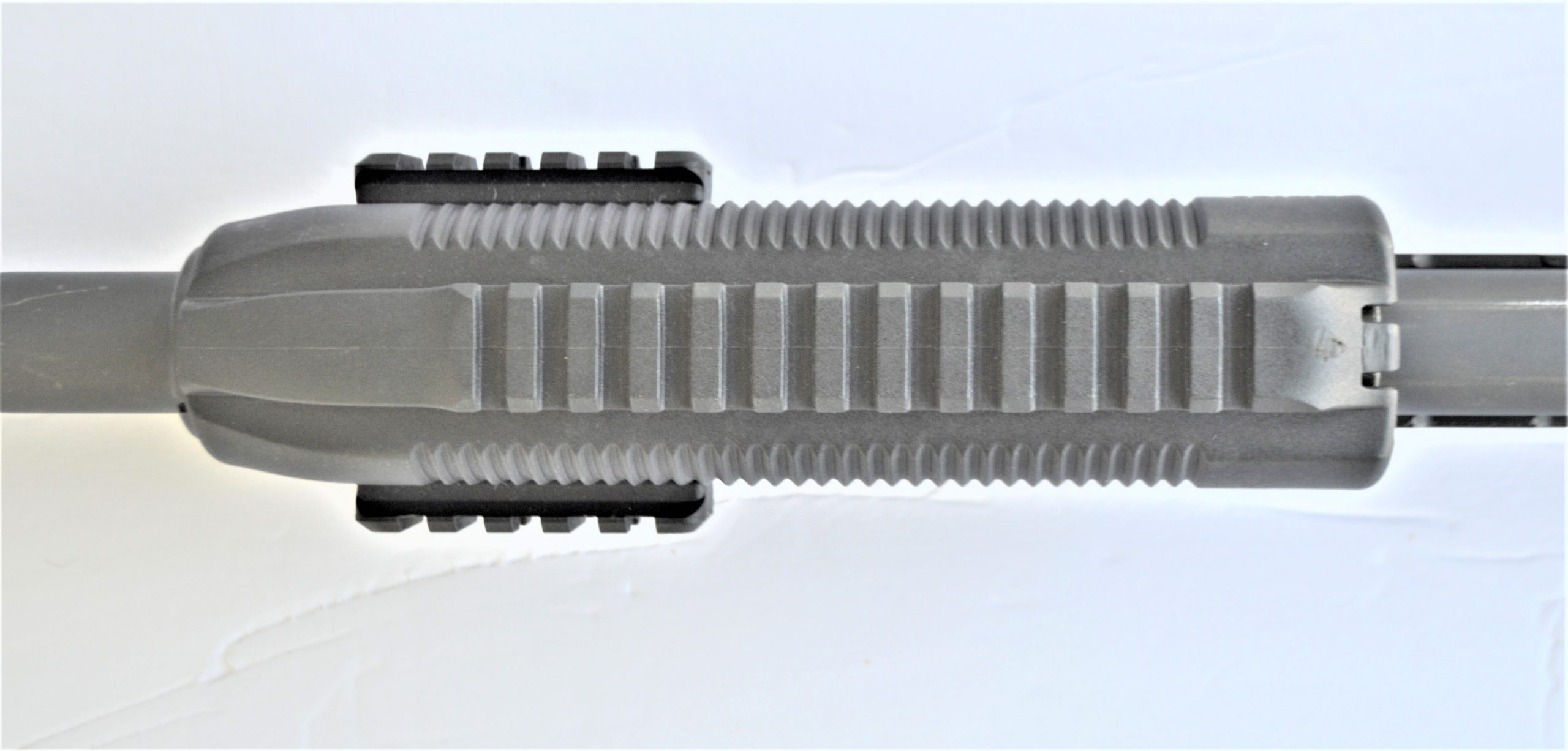 The front sight of the Mossberg Thunder Ranch shotgun is a red fiber optic type. The forend features three light mounting rails. You will probably wish to remove one or the other depending on your grip style. They will give you a rap on the hand otherwise!  The forend is also grooved for good control.