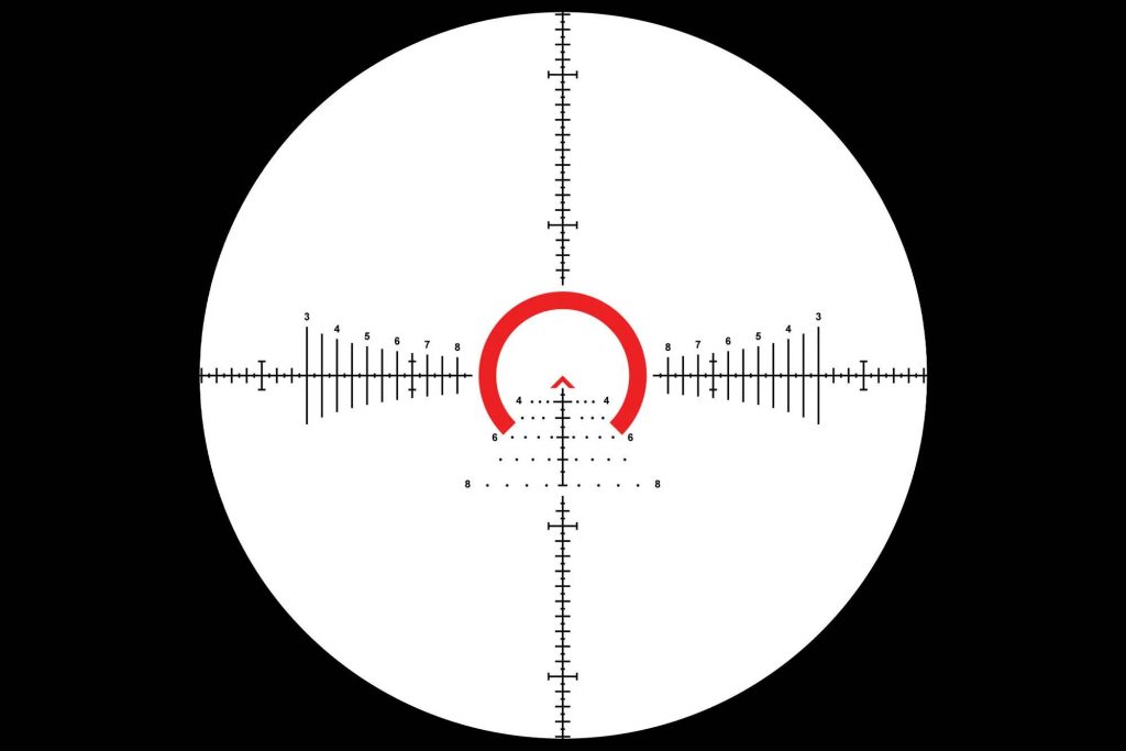 The chevron reticle type will forever remain one of my favorites for placing a precise shot. Dots are well and good for covering a point of aim and squeezing a quick shot off, but anyone who has tried to shoot with a dot and it ended up obscuring a large portion of the target after a certain distance can appreciate the fine aiming point that a chevron gives. The chevron is still easy to use as an occlude and shoot solution too, just like an RDS, as it is about 1 MOA thick, 3 MOA tall total, and about 6 MOA leg to leg.