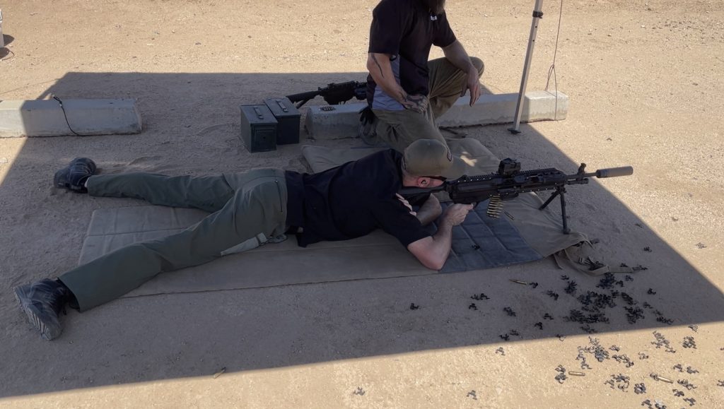 The recoil mitigation system built into the XM250 is straight, glorious, belt-fed black magic. The gun doesn’t recoil so much as it shakes. So much recoil gets taken by the system that much longer bursts are significantly easier. Sight picture is much less disrupted. Controlled automatic fire is possible in far more variations of offhand and poorly supported firing positions, hence my relaxed position in the picture. In any position or at any range not conducive for delivering accurate effective automatic fire, the shooter can put it in semi-auto to make those shots. The select-fire capability is an important aspect that will increase what the individual troop can do with this weapon and showcases its deliberate development as an automatic rifle.