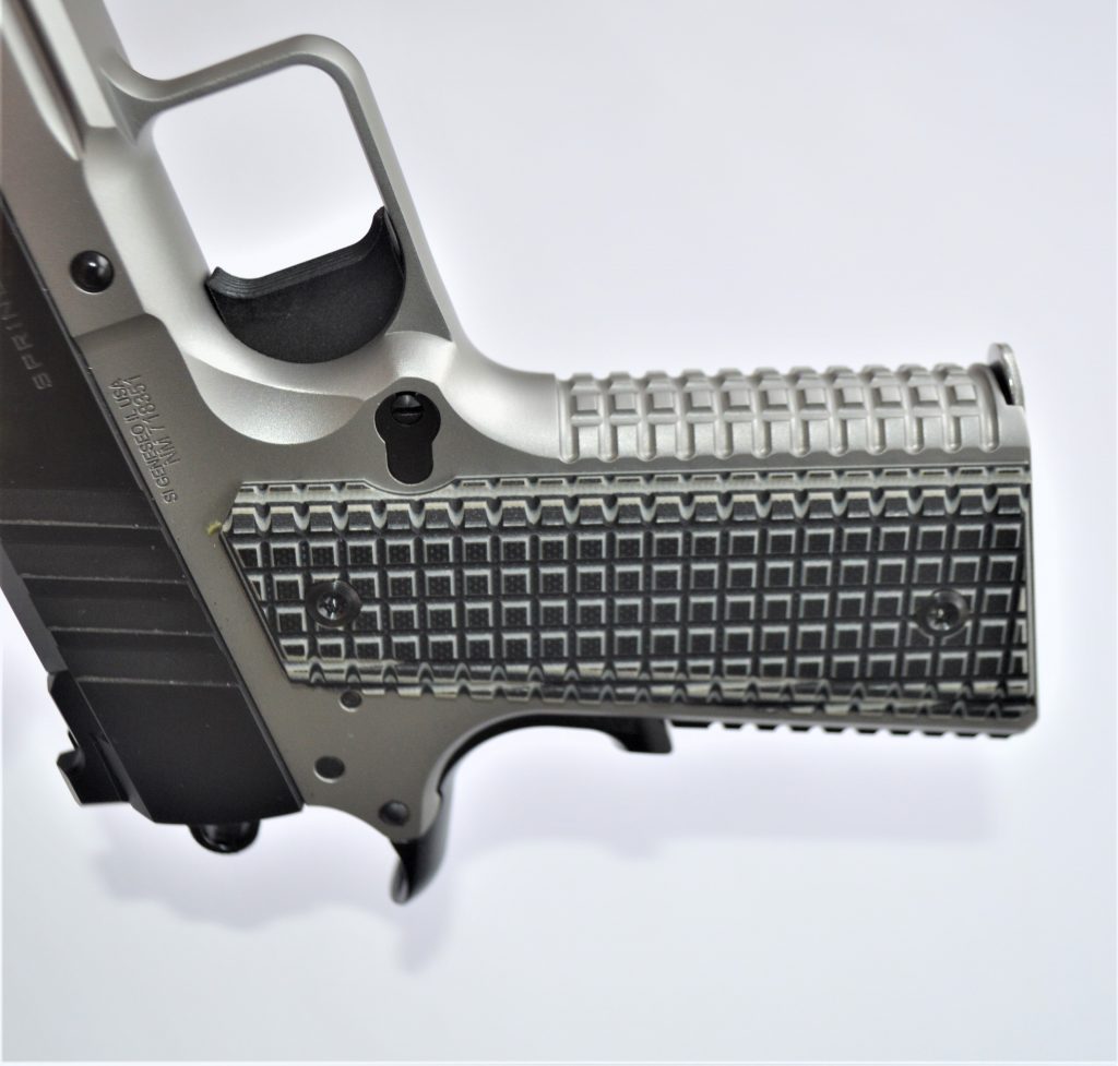 The U notch is very fast in rapid combat shooting. Long range accuracy is also quite good. The slide lock and magazine release are crisp and tight and work as designed. The slide lock safety indents sharply. I cannot tolerate a slide lock safety that doesn’t operate in a positive manner. It isn’t uncommon to find a mushy fit on 1911 handguns- and they are all not cheap guns either. The grip safety is a well designed beavertail that funnels the hand into a firing grip. Some of us allow the palm to cup and move from the grip safety especially with the thumbs forward grip. This safety is positive in operation. The grip safety releases its hold on the trigger about half way into compression. The slide is finished in a nice blue while the frame is stainless steel. The grips are G 10 and well designed with a good balance of adhesion and abrasion. The front strap features a different type of serration, a square type that offers and excellent hold on the front sweat. With the combination of G 10 grips and front strap treatment the pistol should never slip with cold, sweaty or wet hands.