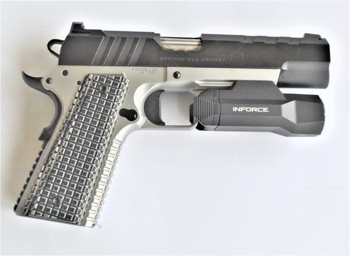 The pistol doesn’t use a positive firing pin block or drop safety. The Springfield uses a 9mm/.38 Super size firing pin and a heavy rating firing pin spring. This prevents the firing pin from running forward to the chambered cartridge and its primer if the pistol is dropped. There is also a light rail for mounting combat lights. I used the new Inforce Wild 2 combat light. With a startling 1000 lumens this light offers an excellent option for home defense and tactical use. (ordered from Cheaperthandirt.com) And finally- the Springfield Emissary 1911 .45 carries a lifetime warranty.