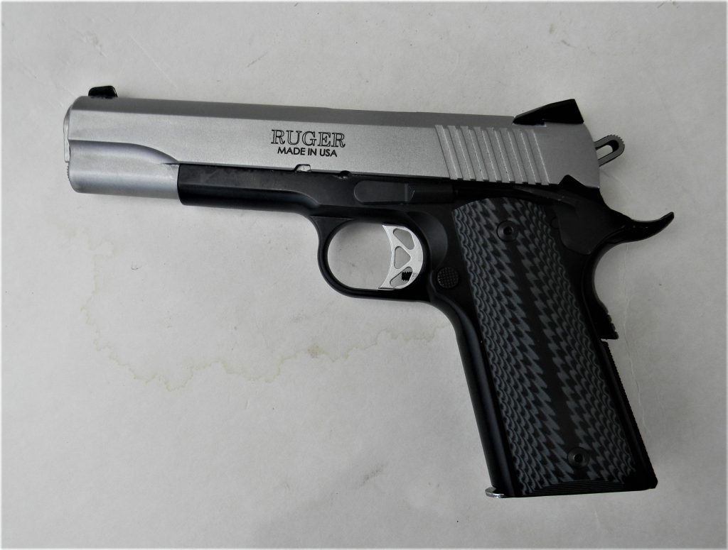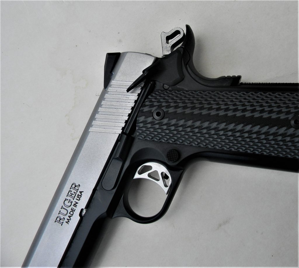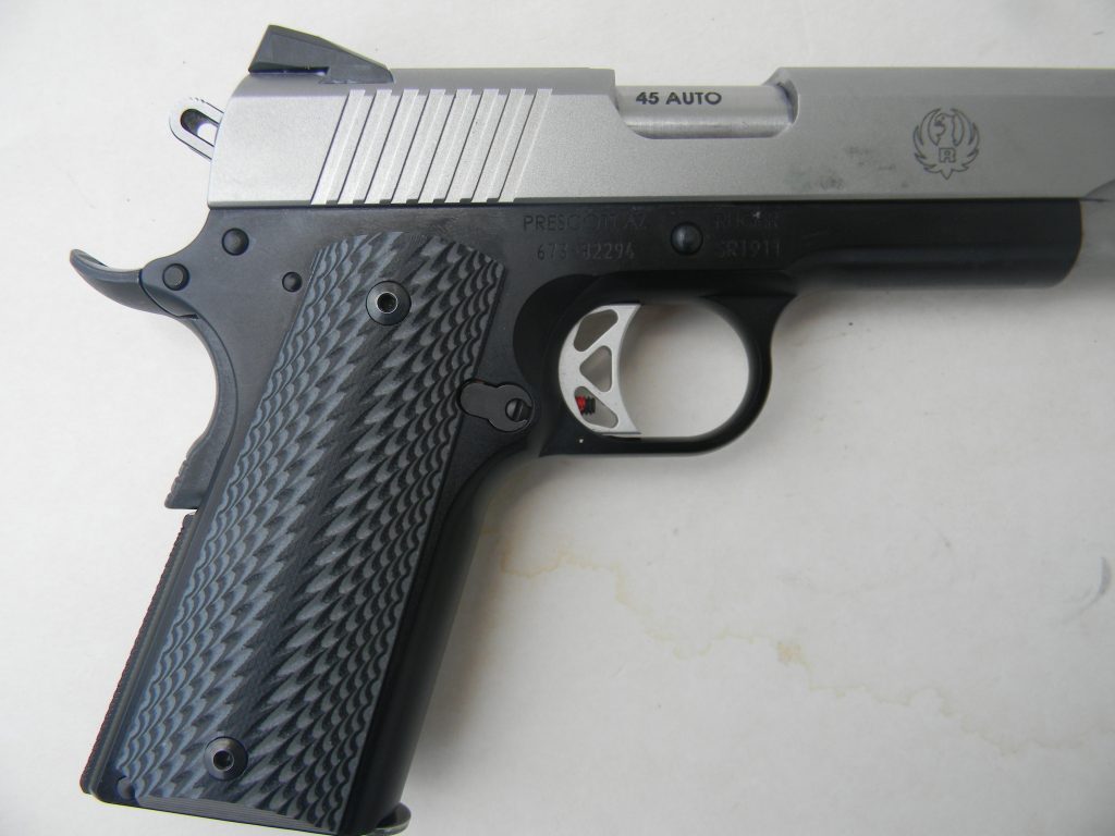 The slide is stainless a type of matte polished treatment, while the frame is anodized. An extended slide lock safety is fast in operation and locks in in a positive manner. The beavertail type memory groove grip safety properly releases it’s hold on the trigger about half way into compression. The pistol is properly carried hammer to the rear and safety on. The grips are G10 and well checkered. The pistol features Novak Lo Mount sights. These are still the world standard with a non snag profile and good sight picture. Trigger compression is smooth at 6.0 pounds even without creep or backlash. The pistol looked like it would be good to go for personal defense and a good fit for the task of packing in and out of the woods and also wearing in town on a daily basis. Ruger means quality rugged durability- but this is a new model so I proofed it well.