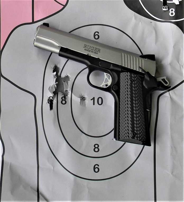 My favorite defense cartridge is the .45 Automatic Colt Pistol. The .45 ACP operates at low pressure compared to many cartridges and offers a full powder burn limited muzzle signature and excellent wound ballistics. Just the same while I handle the .45 well recoil is a factor in the LW frame pistol. Ruger supplies two magazines with the gun, I also used a half dozen Wilson Combat magazines. These are top flight proven magazines excellent design execution and reputation. For the initial firing I used standard 230 grain full metal jacketed ammunition. This is the most affordable .45 ACP loading and the most feed reliable. If the pistol doesn’t function and feed with this load something is terribly wrong. I used Federal American Eagle 230 grain loads for the initial test. After lubricating the pistol I began firing at 7 yards. The pistol seems to have less muzzle flip than a Commander .45. The long slide and heavier recoil spring have less snap. Just the same fifty rounds is plenty in a firing test. The first few magazines you don’t notice- after four or five magazines the wrist tell you that you are firing a pistol that kicks more than a Government Model .45. When you consider the pistol will be more easily carried and will come out shooting and you will not be in an extended gunfight- I hope not- the LW Government Model is a good trade off. I fired a magazine of the Speer Gold Dot 200 grain +P. This is a formidable loading screaming out of the Ruger’s five inch barrel at 1039 fps. It functioned and I controlled the string and I don’t care to do it often. I will reserve this loading for steel frame .45s. I also fired two good defense loads for accuracy. Firing from a standing braced barricade position I fired the Federal Hydra Shock 230 grain load and the Speer Gold Dot 230 grain load. Each printed a 2 inch group at 15 yards.