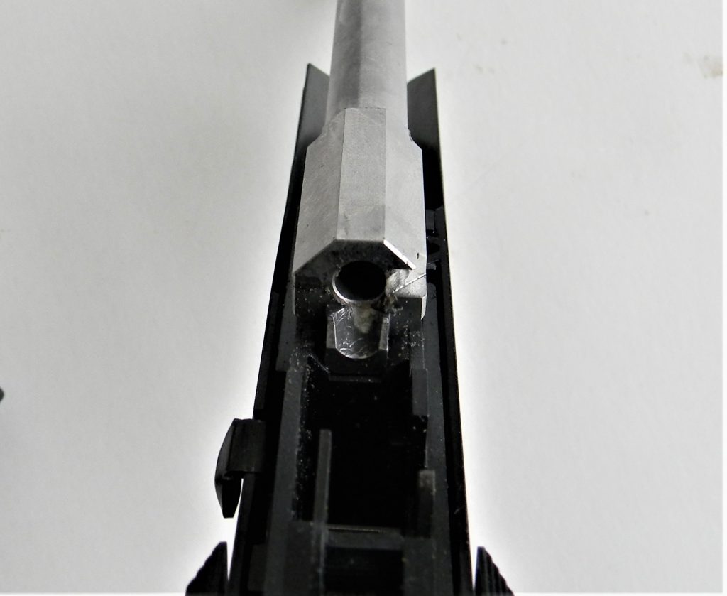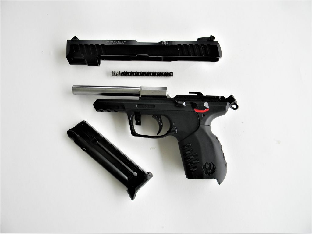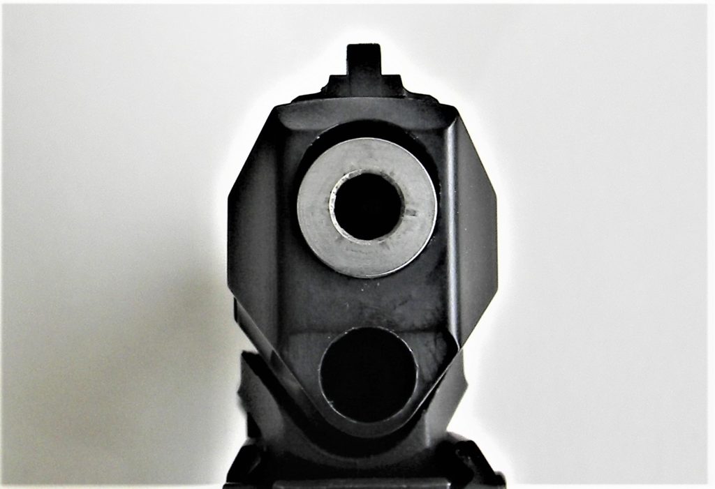 The pistol features a changeable grip frame. The grip as delivered fits my hand well. Large size hands may find the grip sleeve a nice accessory. The grip sleeve isn’t easily changed and requires some effort. The pistol is supplied with magazine base pads for the two ten round magazines. The magazines are not difficult to load to full capacity. Take down is simple enough. A take down lever inside the trigger guard is pressed down to release the slide. Triple check the handgun to be certain it isn’t loaded and you will have no problem running the slide to the rear and up off of the receiver rails. It isn’t difficult to run the slide back into battery. This is a blowback design. The barrel remains fixed to the frame during disassembly.