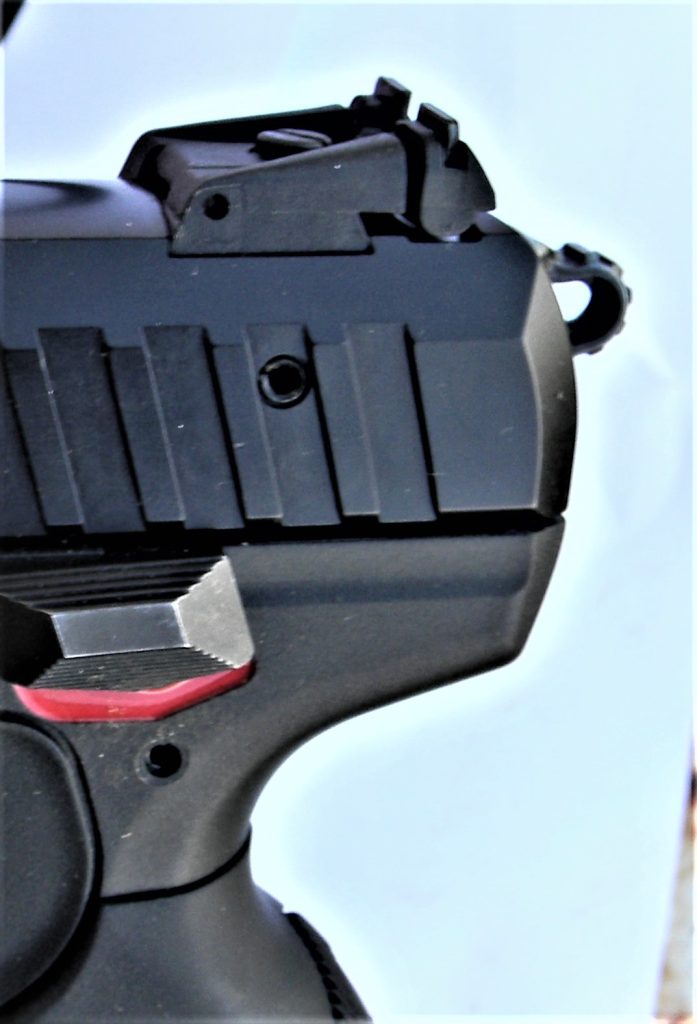The slide is nicely machined from aluminum. You may wonder how the tiny recoil spring functions but an aluminum slide and the .22 LR cartridge don’t produce a lot of momentum. The guide rod is a simple plastic unit. The ejector and extractor are larger than needed for this cartridge and all parts are more than strong enough for the task of .22 rimfire reliability. That’s not a hasty conclusion the SR 22 has proven reliable in thousands of examples. The grips are nicely serrated for a firm grip. The slide features both forward and rear cocking serrations a nice touch on a rimfire handgun. The rear sights are fully adjustable allowing the shooter to sight the pistol in properly. The dovetailed front sight offers a possibility of adjustment with the proper sight pusher. Ruger makes some of the best adjustable pistol sights and they are found on even some affordable models. The SR 22 also features a light rail for mounting lights or lasers.
