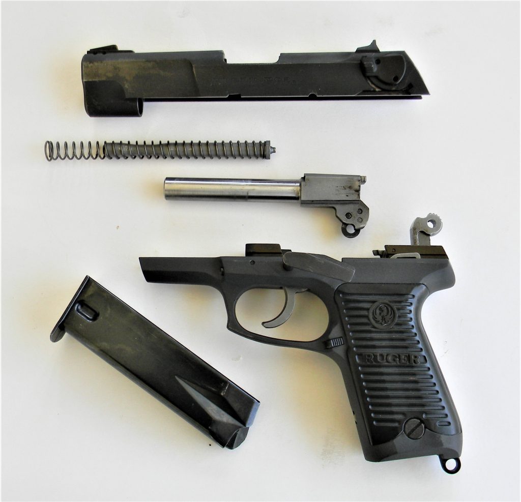 Disassembly requires the pistol to be unloaded and the slide locked to the rear. Reach inside the slide and press the ejector downward. Tap the slide lock to the left and the slide may be removed. The recoil spring and guide are easily removed and the barrel then simply falls out. The pistol was introduced in 1985 and competed in military service trails. It was a difficult pistol to find for sale until 1987. Compared to some of the 9mm pistols available at the time the Ruger has proven at least as durable. No domestic self loader of the time is in the class with the Ruger’s reliability. Ergonomics are almost terrible. Since the pistol doesn’t kick much- it is a very light kicker- the grip shape may be worked with. The trigger action isn’t smooth at all. Both SIG and Beretta double action first shot pistols are much smoother in operation and even the fat Beretta grip is handier than the Ruger. The Ruger isn’t as accurate although it is accurate enough for most chores. What the P85 is is reliable and durable in the long term. It is also affordable. It isn’t unusual to find used examples for sale at less than three hundred dollars. This isn’t an out of print pistol particularly sought after but if you need a bag gun truck gun or bug out gun with no likely worries the P85 may fill that bill.