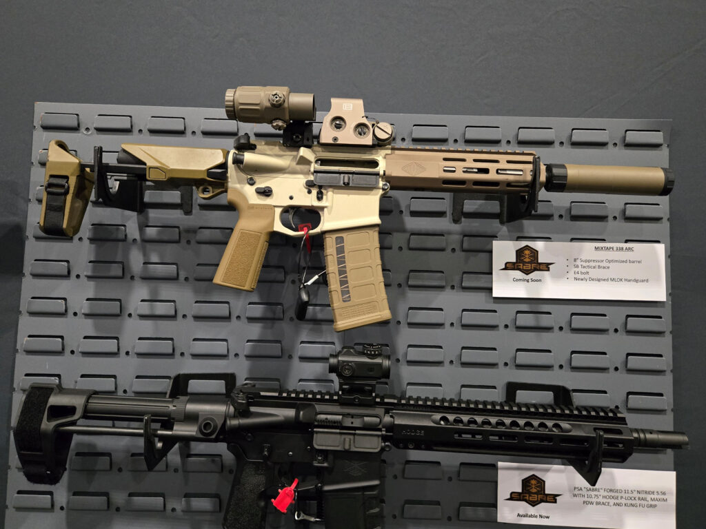 Palmetto State Armory (PSA) previewed the new Mixtape at SHOT. This is a suppressor-optimized AR pistol chambered in .300 Blackout or .338 ARC. They had a .338 on display at the show. It uses an 8-inch barrel, PSA dual ejector E4 bolt, and a PSA Sabre trigger along with a Radian charging handle.