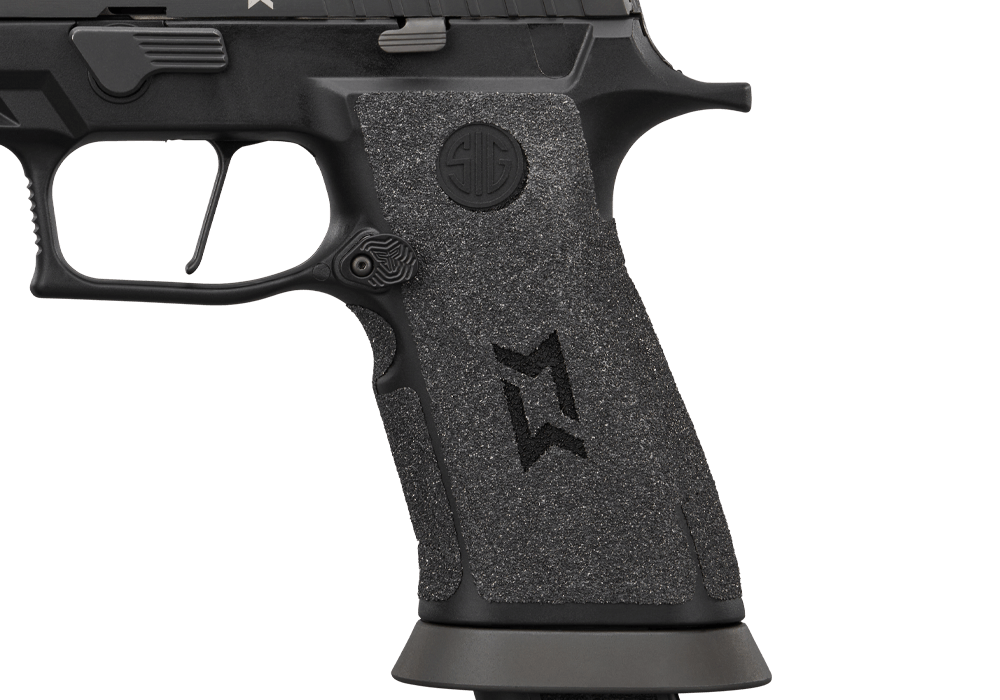 SIG teamed up with Hogue to produce a set of stick-on grips to increase traction. They are the Hogue Heavy Grit Max Michel edition Wraptor Grips. We have a Springer Precision magazine release as well as the SIG Standard XRay3 day/night sights. It’s quite the package and a great way to kick off the off-duty program.