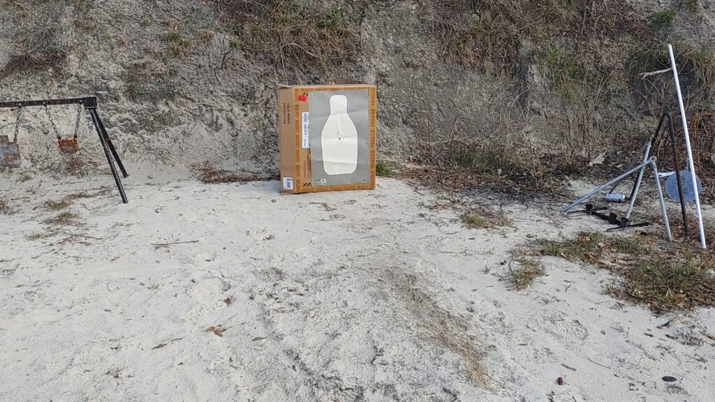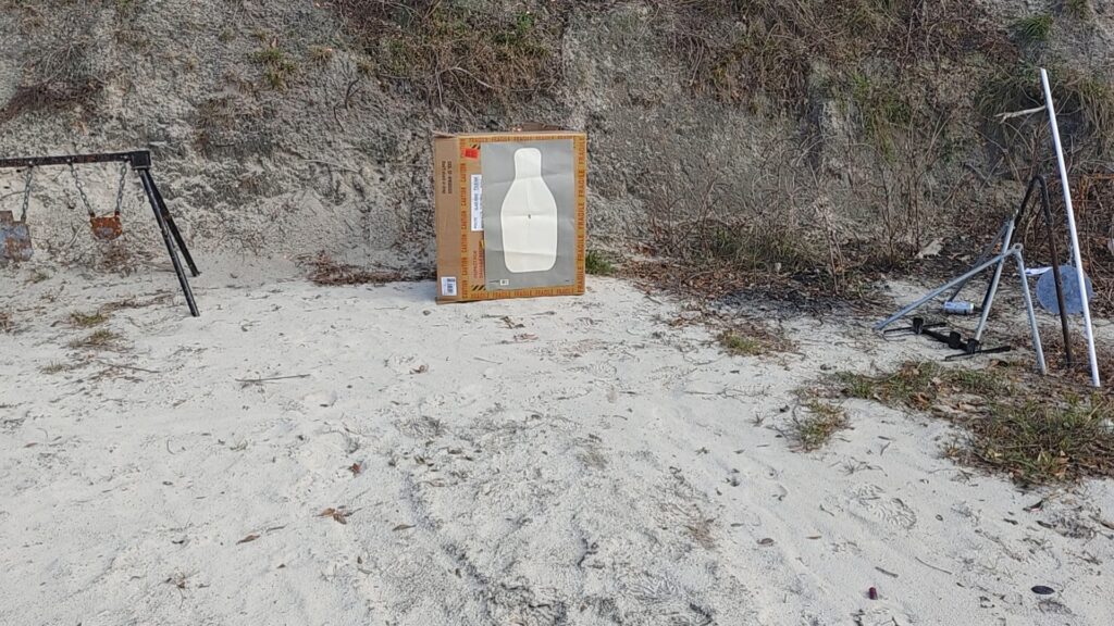 I folded another target over the FBI Q Target to act as ‘cover.’ The purpose was to test angles to see how predictable the shot would fly. I found hardly any room to experiment. Too close to the shooter, and the angle didn’t allow for skipping shot. You had a few feet in front of the threat to work with.