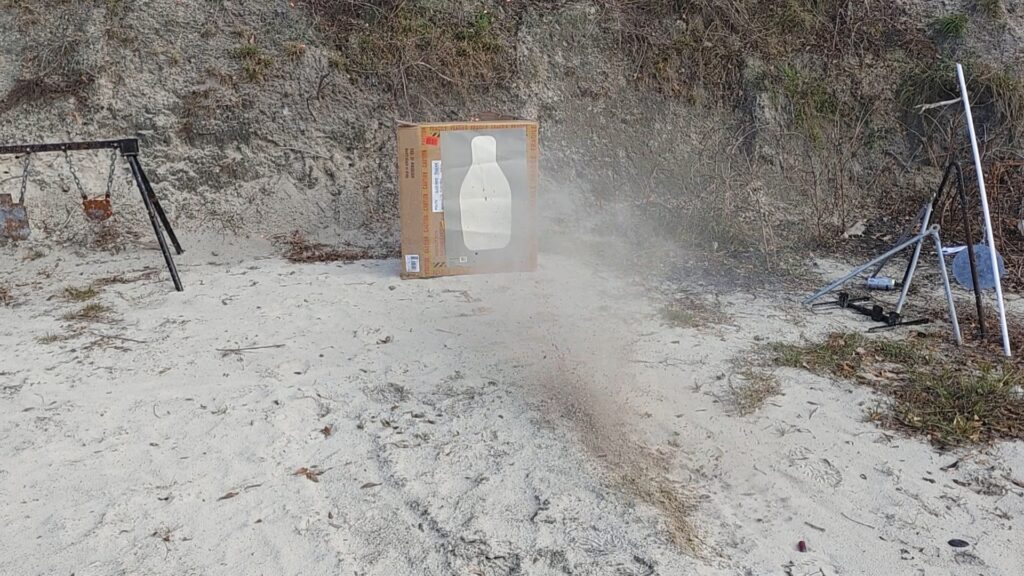 I moved to steel poppers, and it became clear that it takes a lot of speed out of the buckshot. The large steel popper got hit and just barely fell over. Lower velocity and likely fewer pellets hitting the target created less force to knock the target over. I’d be curious to do some skipping shots into gel to see how deep it would penetrate.