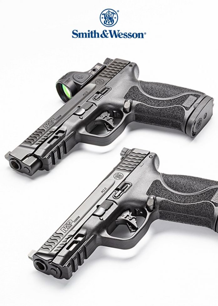 INTRODUCING the SMITH & WESSON M&P®10MM M2.0™ PISTOL SERIES: powerful, accurate, efficient. These full-size pistols feature optics cut slides, a new flat-face trigger design, 15+1 capacity, and are available in 4″ and 4.6″ variants.