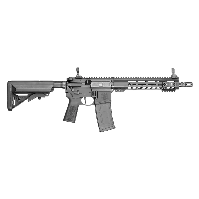 The first rifle is simply called the M&P 15 SBR. It’s chambered in 5.56mm and has an 11.5-inch barrel. The barrel is threaded and comes with an A2 flash hider. It’s fitted with a 9-inch free-float handguard with M-LOK slots. Smith provides a 2-inch M-LOK rail.