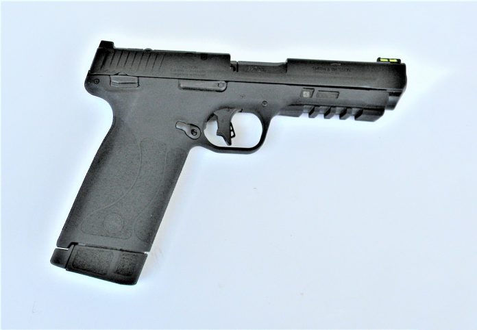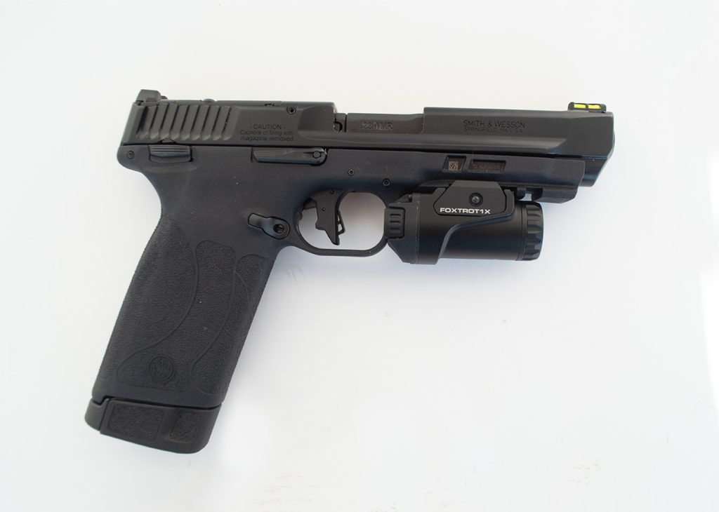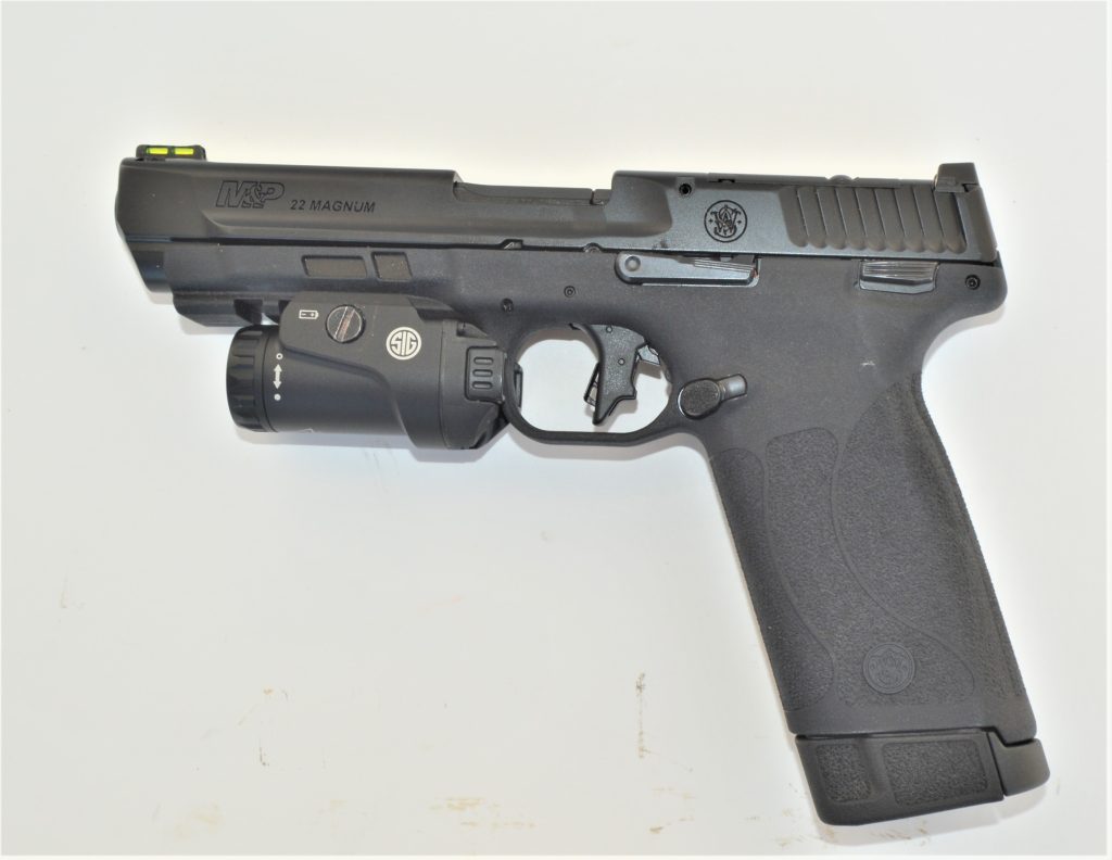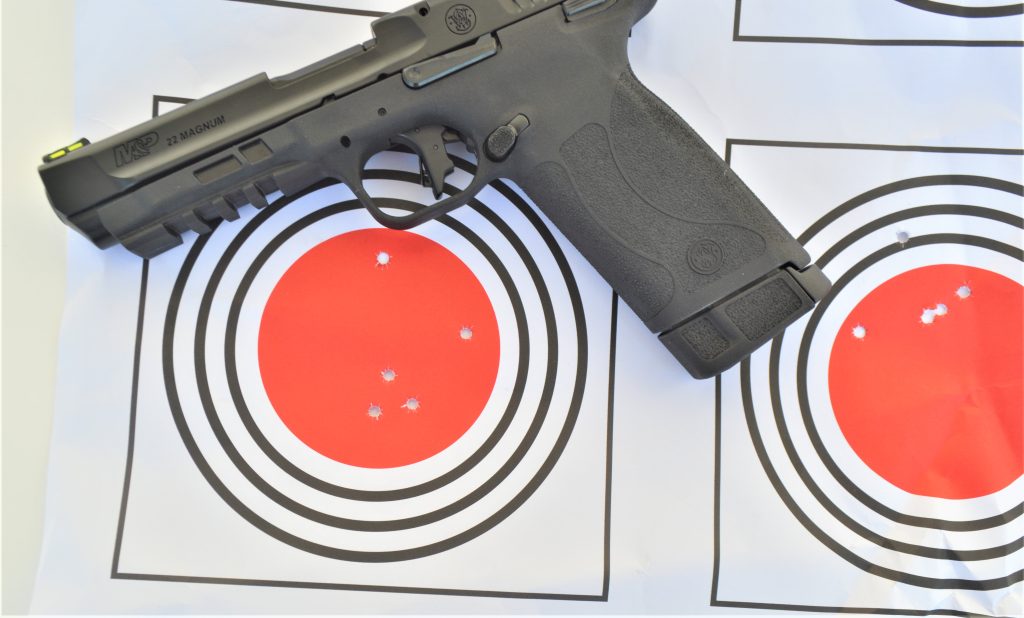 After testing quite a few 9mm and .45 handgun not to mention the .357 and .38 revolvers I often review it is a pleasure to fire a fun gun for a change. The Smith & Wesson M&P .22 Magnum is a fun gun by any definition. The M&P .22 Magnum is a polymer frame hammer fired .22 Magnum automatic with a thirty round magazine. The top of the slide is nicely serrated while the slide itself is well finished. The slide features a long flat on each side running into a bevel. The inner barrel is nicely crowned.  The rear sight is nicely serrated. A set screw is loosened to allow adjusting the sight for leverage. The front sight is dovetailed and features a fiber optic insert.. The frame is polymer. An accessory rail accommodates a range of lights and lasers. The safety is ambidextrous. So is the slide lock. The safety doesn’t lock the slide in place when applied. This means the pistol may be loaded with the safety on. The safety is positive in operation. To disassemble the pistol tap out the takedown lever as you hold the slide about .25 inch to the rear. The takedown lever slide/stop is easily taken out. Remove the recoil assembly and next the barrel. Easy enough. The gas operated Temp system features a barrel inside a shroud. Rotate the barrel to remove the inner barrel for cleaning.