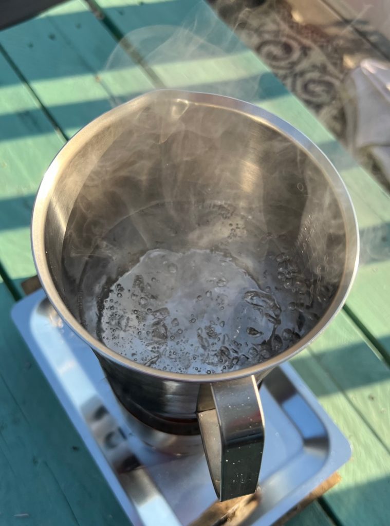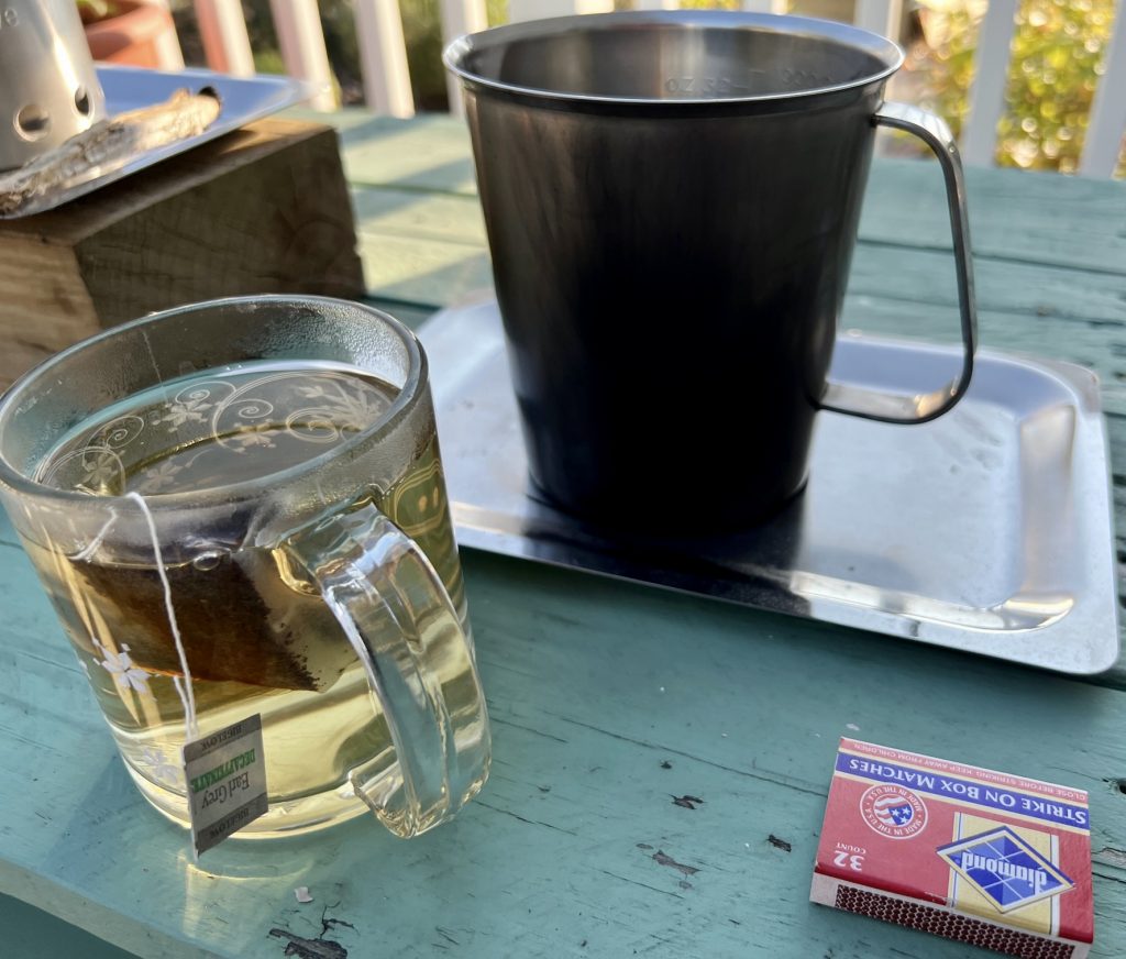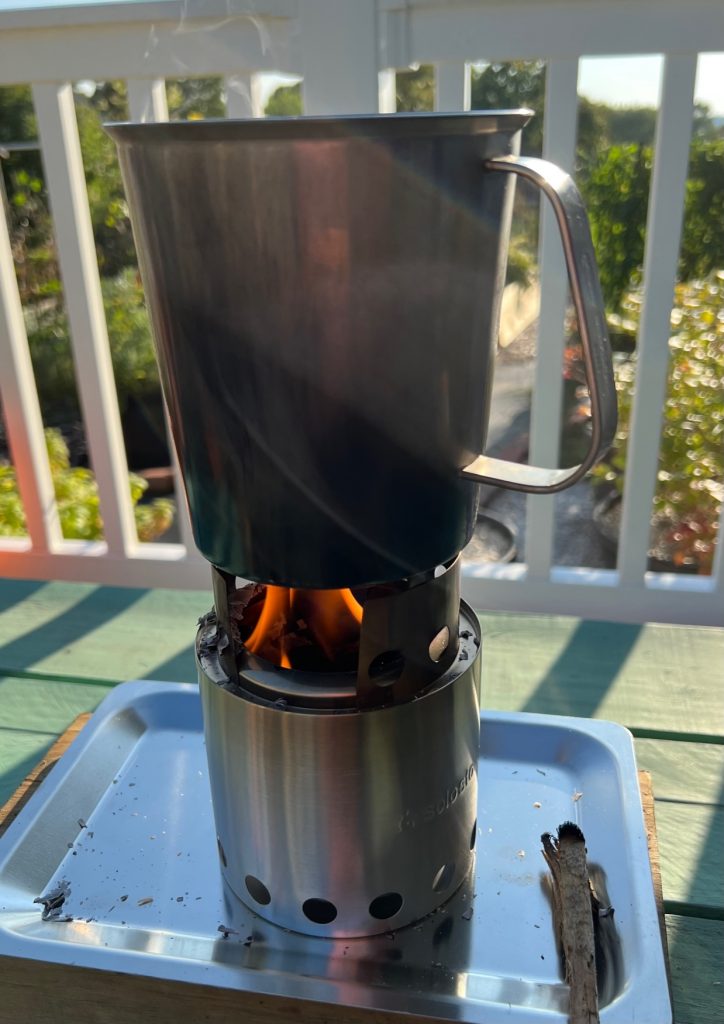 In addition to the pot that I bought, I also found a small stainless pitcher/pot in my gear which fits perfectly so that’s what I used for the experiment. As the saying goes, “Two is one, one is none.” So now I have two pots to fit my little Solo Lite Stove and I can have tea AND soup when the grid goes down.