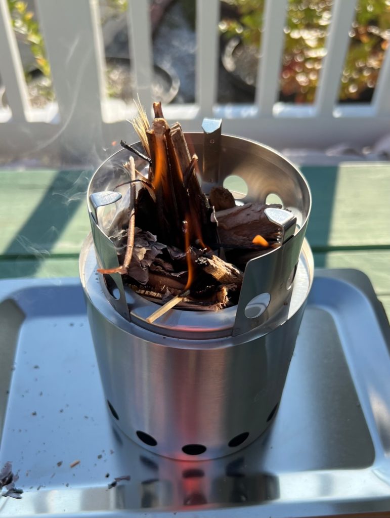 Apartment/patio dwellers who don’t have a yard with sticks could consider buying a bag of big chunk mulch like this and keeping it in a Rubbermaid tote in a closet. Keeping emergency fuel on hand for a small stove like this would be a wise idea. And sticks are perfectly safe to store indoors – unlike some other fuels. For a stove this small you don’t need big wood or tree limbs – just sticks. You aren’t cooking a three course meal, you’re heating soup or boiling water to rehydrate your freeze dried Mountain House dinner. Keeping it simple is the best strategy. (Caveat that you should use this stove at your own risk. It is not recommended for use in an enclosed space or under a flammable overhang.)