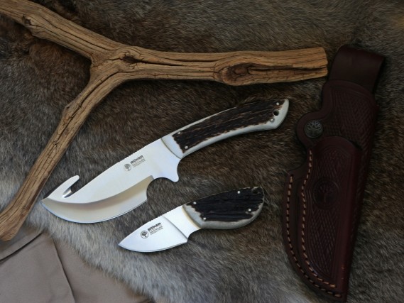 Among their standout products is the Arbolito Guides Combo set. This impressive duo features satin-finished blades and genuine stag handles, marrying form and function. The set includes a 4.25-inch gut hook skinning blade designed with a generous forward finger choil for exceptional control. The built-in gut hook keeps mishaps at bay during skinning.