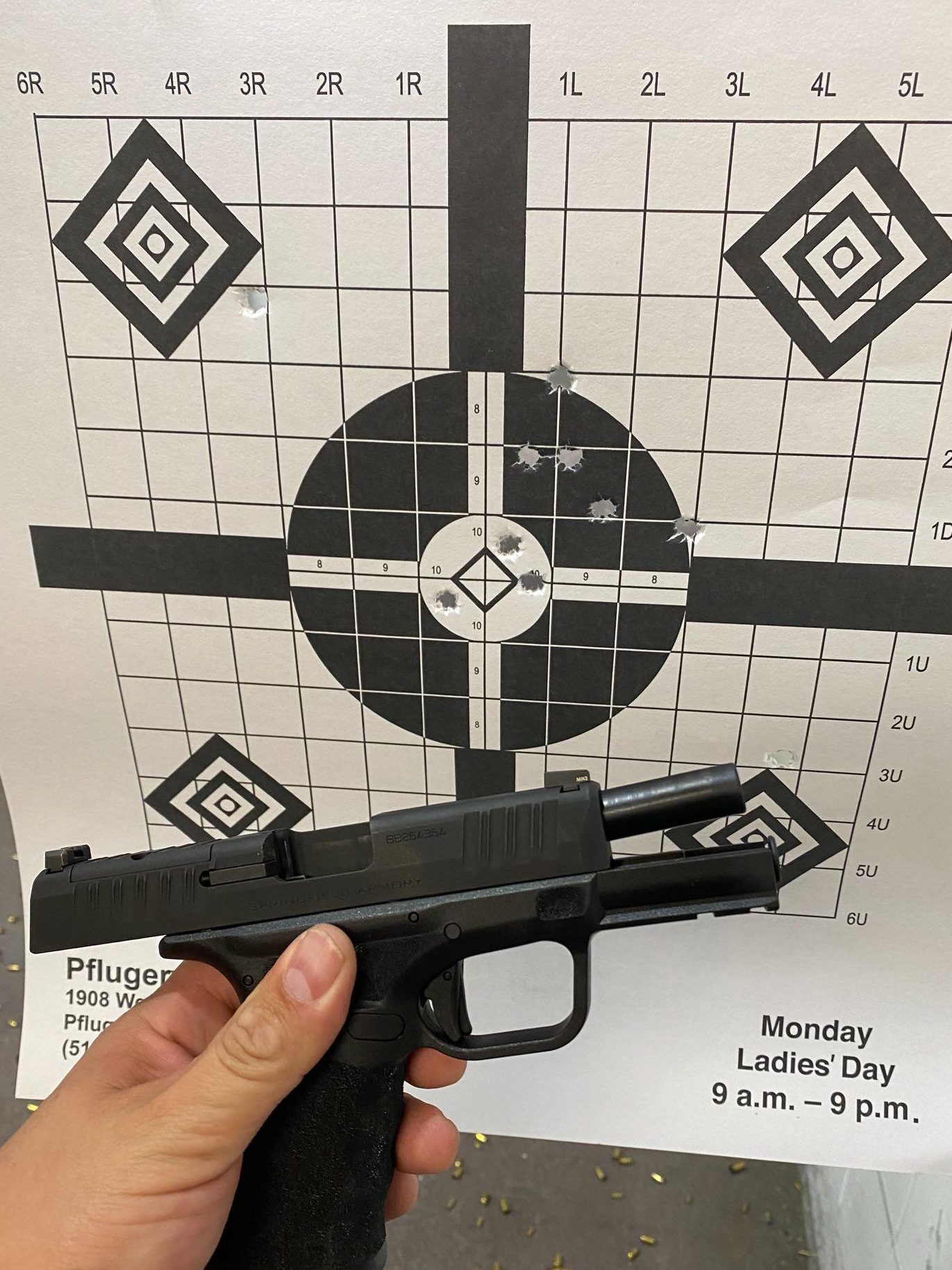 During our impromptu range session, we christened this new Hellcat Pro with three boxes of 115 grain 9mm CCI Blazer range ammo. I’m very comfortable using this cartridge across pistols and find it to provide very reasonable accuracy. Again, due to its smaller overall size and weight, the relatively mild Blazer round starts to feel somewhat warmer when fired from this pistol. It is not a big deal and it is only part of the territory of slimline 9mm pistols optimized for carry. At least it is easier to shoot than an Airweight J-frame! The Springfield Hellcat Pro’s trigger break is very reasonable and easy to manage; it does not have any spongy feeling or creep. I took some shots at 3, 5, and 7 yards just to get a feel for things. At one point, I decided to hang a clean target with an NRA B-8 sized ring and have the indoor range’s pulley system move it all the way back to their 25 yard line. I must admit that the result of my 10 round group at 25 yards using “range ammo” and a pistol I had never handled or fired before impressed me. More so because the Hellcat Pro’s night sights are great for defensive carry and shooting scenarios but are not necessarily ideal for precision shooting. Honestly, the Pro’s “shootability” is what prompted this review.