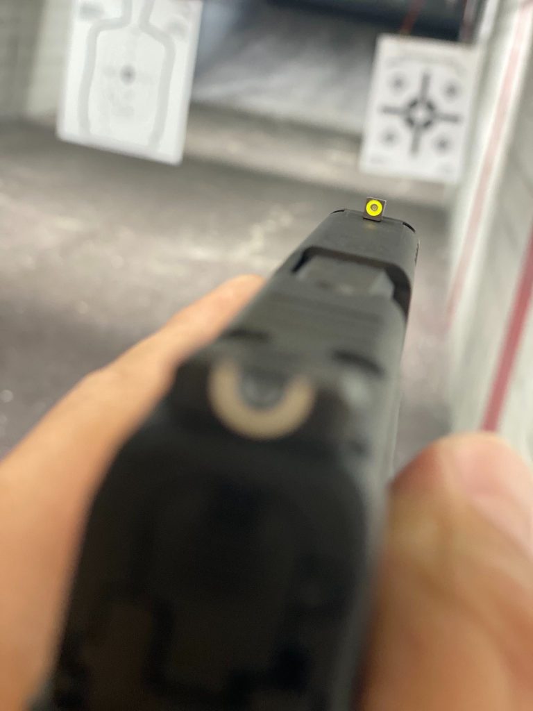 At a glance my single favorite thing about this pistol in particular are its factory night sights. The front sight is a thick and has a luminescent eye-grabbing laser yellow ring that surrounds a vial of tritium. The rear sight is a very generous U-notch with a white outline. Lining up the sights takes little effort and these make a lot of sense on carry gun. I have a minor reservation about the white outline of the rear sight. I think it is too busy, can be distracting to the eye and completely unnecessary. I found that when using either target focused or a front sight focused shooting technique, the white outline simply did not add anything. If I were to own and carry one of these pistols, I would personally use a permanent market to cover up this outline.