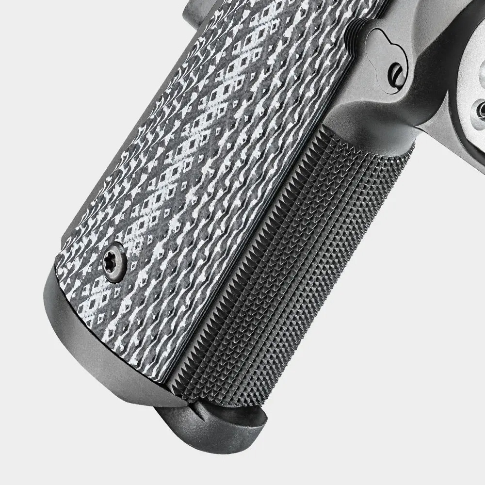 Initial accuracy work showed the pistol capable of two inch five shot groups or less at 25 yards with 230 grain hardball. The Springfield  TRP is equally at home in fast shooting, accurate shooting off hand or from the barricade position. The TRP sets well in the hand, offering excellent balance. While the forward gripstrap checkering is appropriately raspy at no time was the grip uncomfortable. If I were attending a training class that demanded 1,000 rounds be fired in a compressed time frame I would opt for shooting gloves. The G 10 grips are cut away to allow rapid magazine button manipulation.